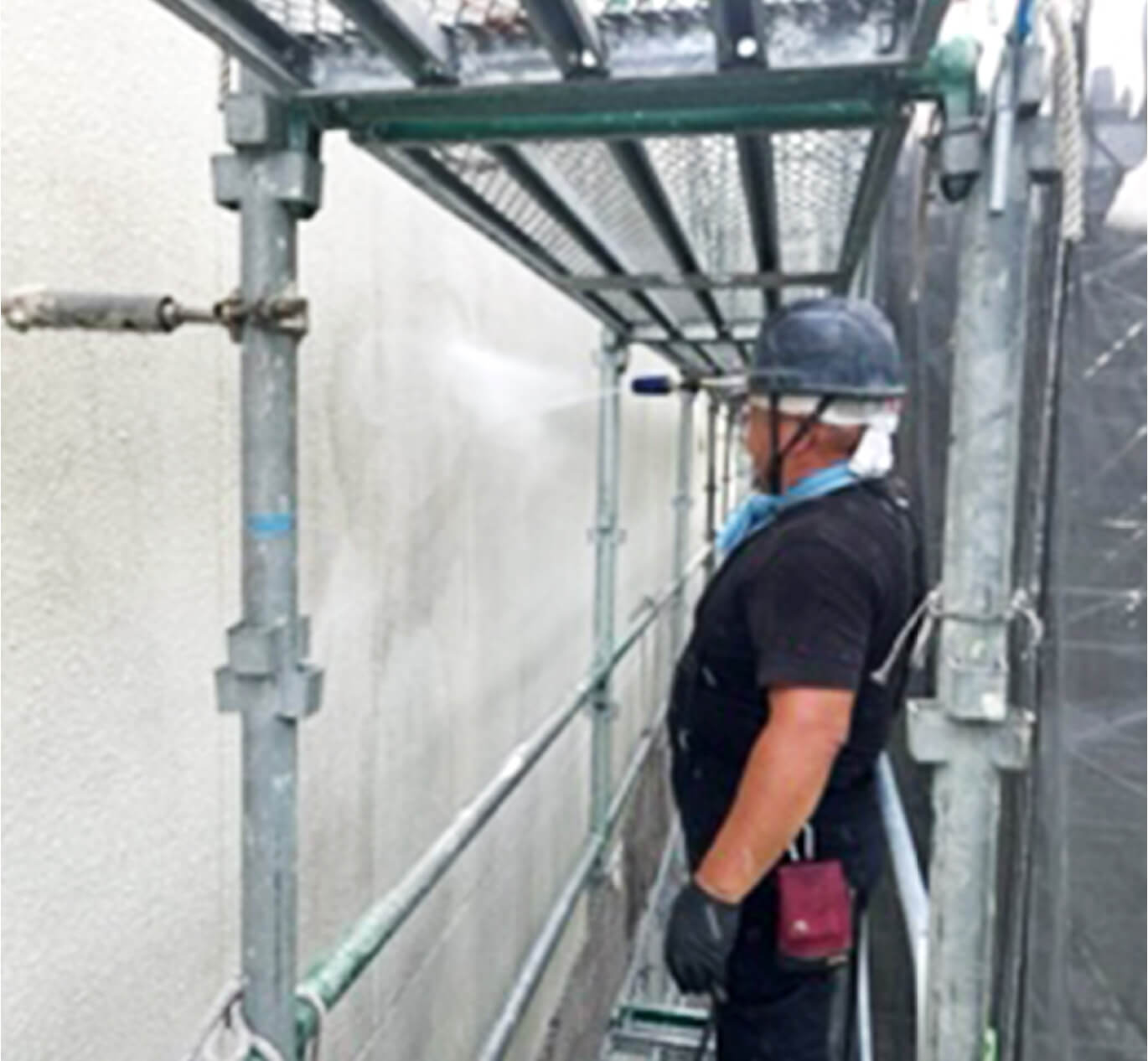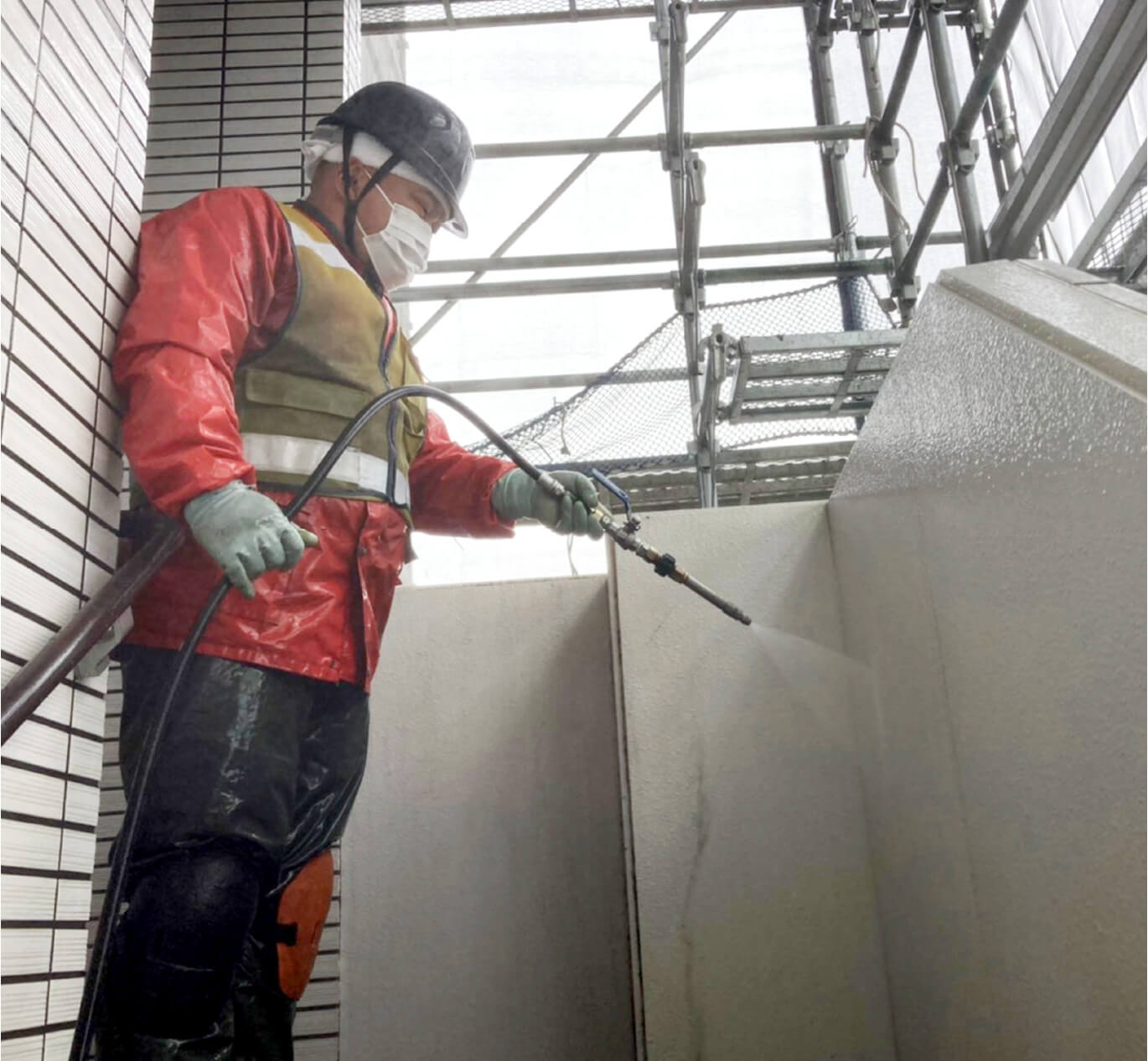 高圧洗浄機を使って外壁や塗装面、タイルや屋上の汚れを落とす洗浄工事、バルコニーやガラスサッシのクリーニングといった建物清掃に関わる仕事や、様々な現場で他の職人さんが作業しやすいように下準備を行う雑工事など、幅広い作業を行います。